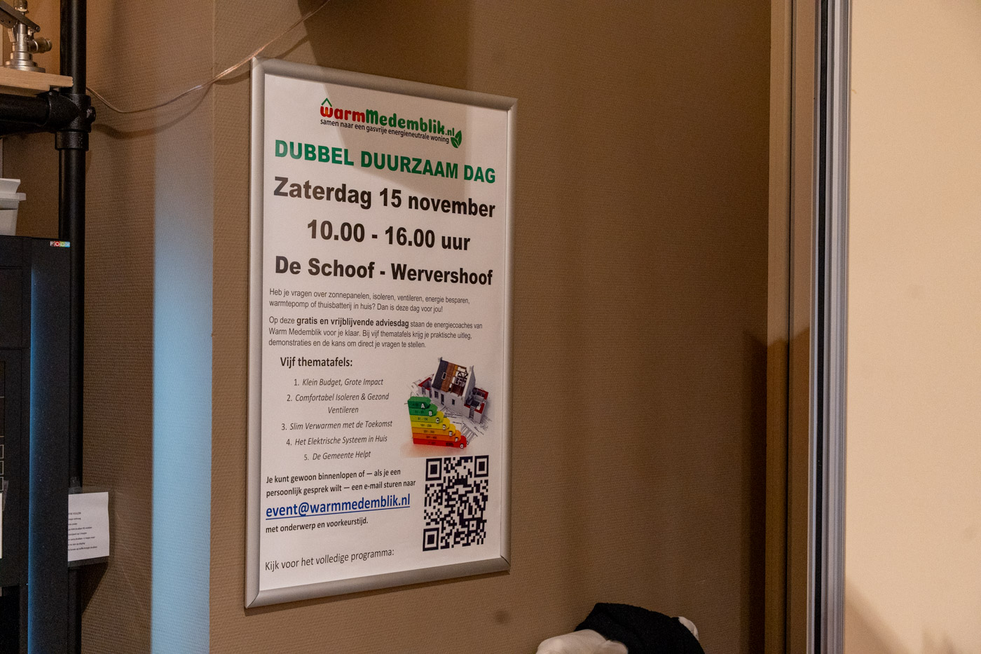 WERVERSHOOF – De Dubbel Duurzaam Dag in cultureel centrum De Schoof heeft zaterdag ongeveer honderd bezoekers getrokken. Tijdens de bijeenkomst gingen bewoners in gesprek met energiecoaches over energiebesparing, isolatie en duurzame technieken in huis. De organisatie spreekt van een geslaagde dag.